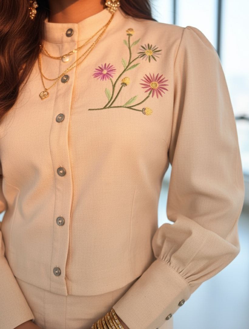This is a stylish and playful Embroidered Co-ord Set made from 100% organic cotton fabric. The set features a cropped jacket with a button-up front, dramatic puffed sleeves that gather at the wrist, and delicate floral embroidery across the chest. It is paired with a matching high-waisted mini skirt and shorts underneath which also has coordinating floral embroidery. The entire set is in a neutral beige or off-white tone, giving it a charming, contemporary Western-wear feel.