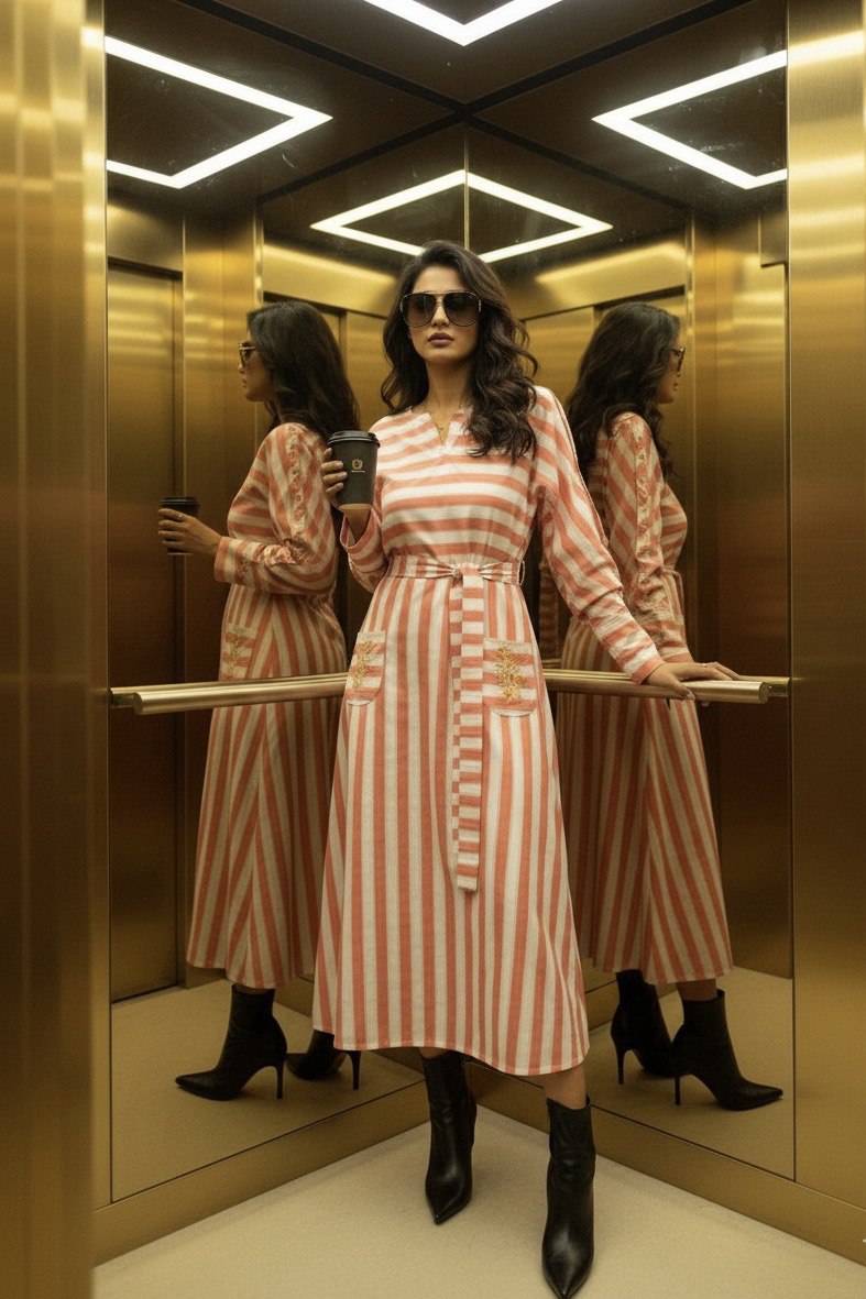 This dress is a relaxed, elegant long maxi crafted in cotton twill satin, giving it a soft sheen and structured drape. It features coral and white vertical stripes with a comfortable, easy silhouette. The design is elevated with delicate hand-embroidered details on the pockets and sleeves, adding an artisanal touch to the otherwise minimal and breezy look. Perfect for a chic daytime outing with a hint of vintage charm.