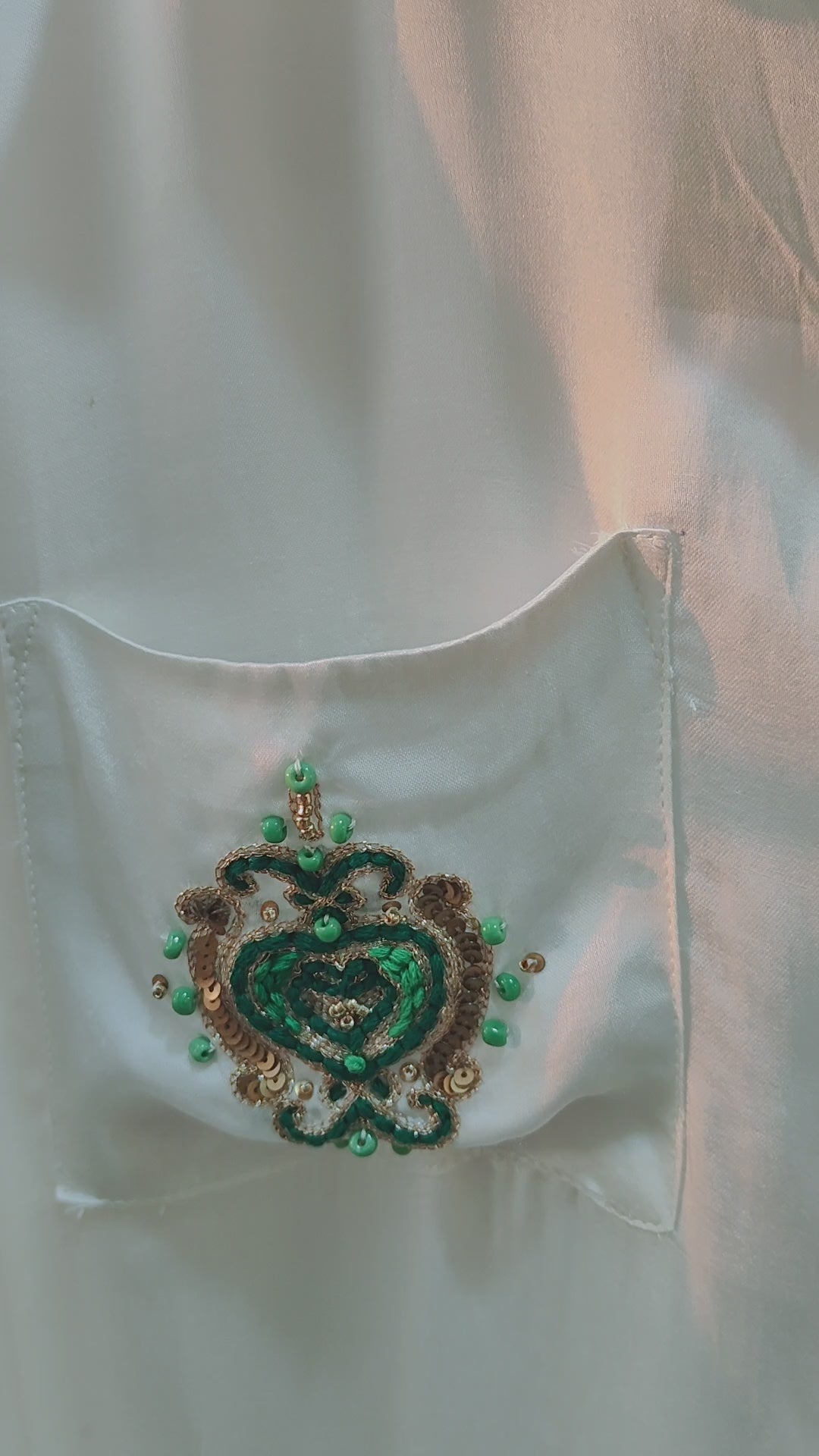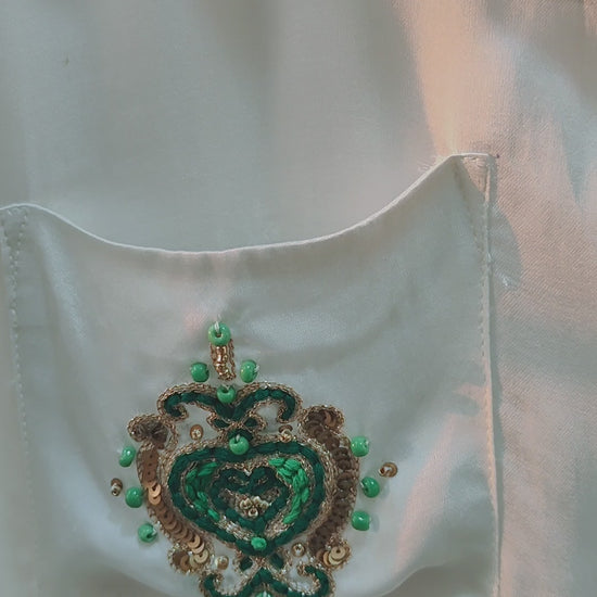 This design is centered around the Heart Chakra (Anahata) embroidery, meticulously placed on the pockets to serve as a reminder of emotional balance, empathy, and inner peace. Finished with striking emerald-green contrast detailing on the collar and cuffs, this shirt is a wearable intention for an open and radiant heart.