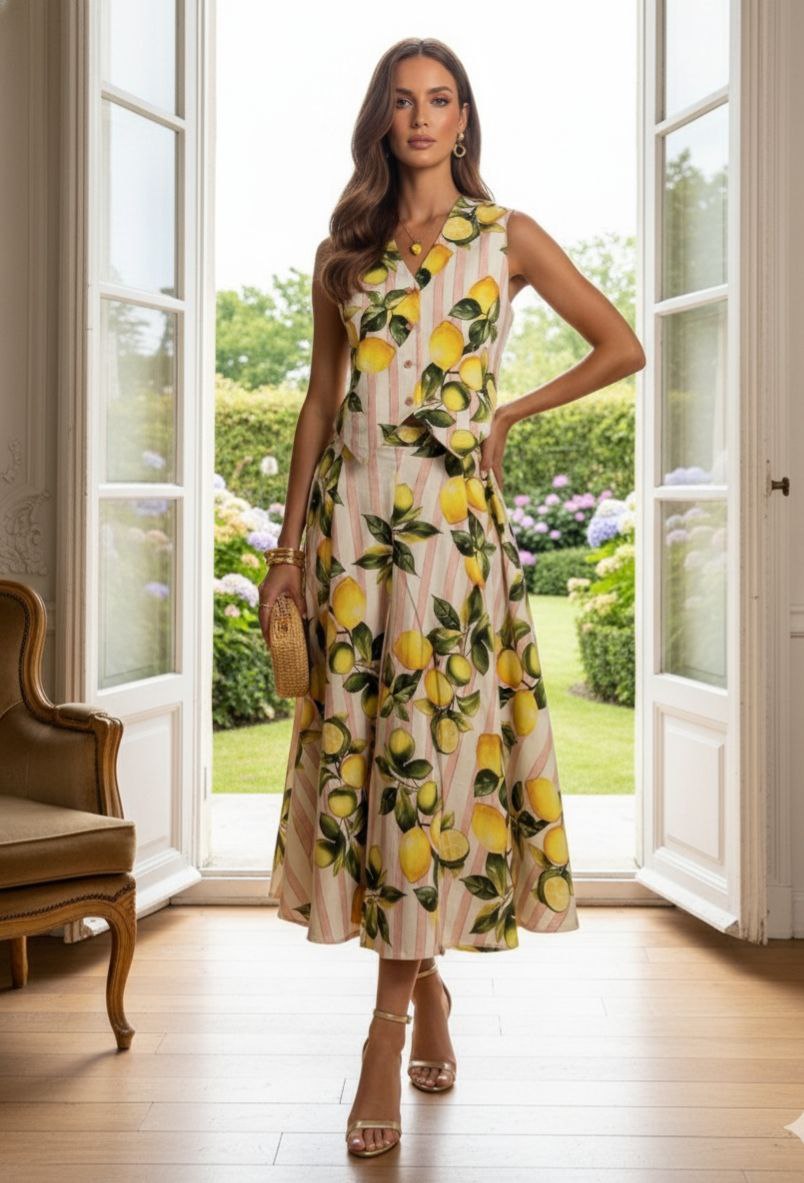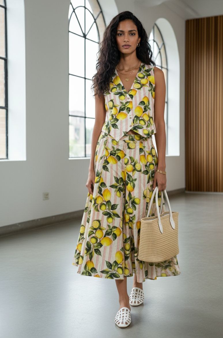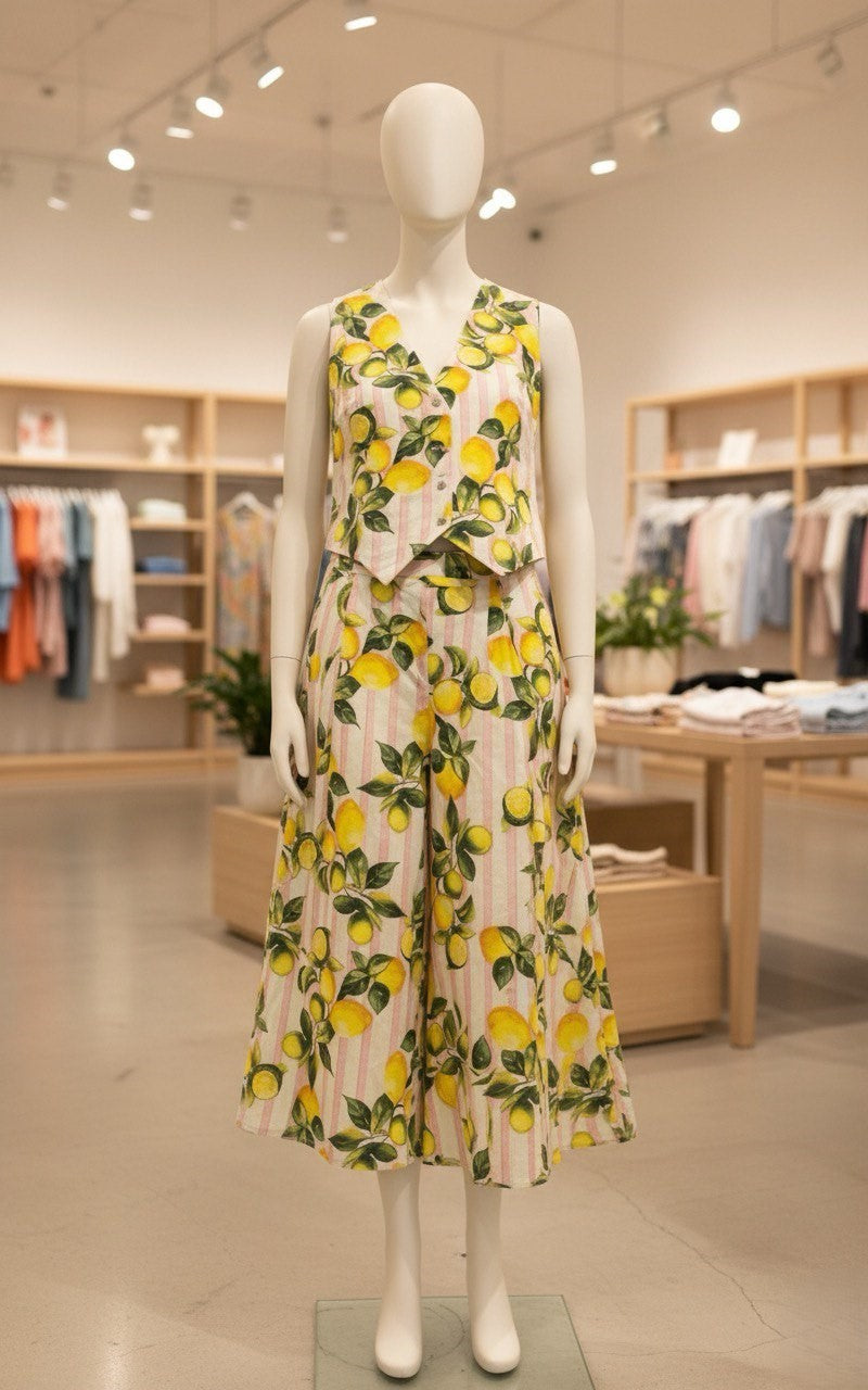 This is a vibrant and cheerful Lemon Print Co-ord Set, made from 100% organic cotton fabric. The set includes a sleeveless V-neck vest/top and high-waisted, wide-leg culotte pants with a cropped length. Both pieces feature a delightful pattern of bright yellow lemons, green leaves, and soft pastel stripes. The top is slightly cropped to meet the high waist of the trousers, creating a cohesive, stylish, and comfortable summer look.