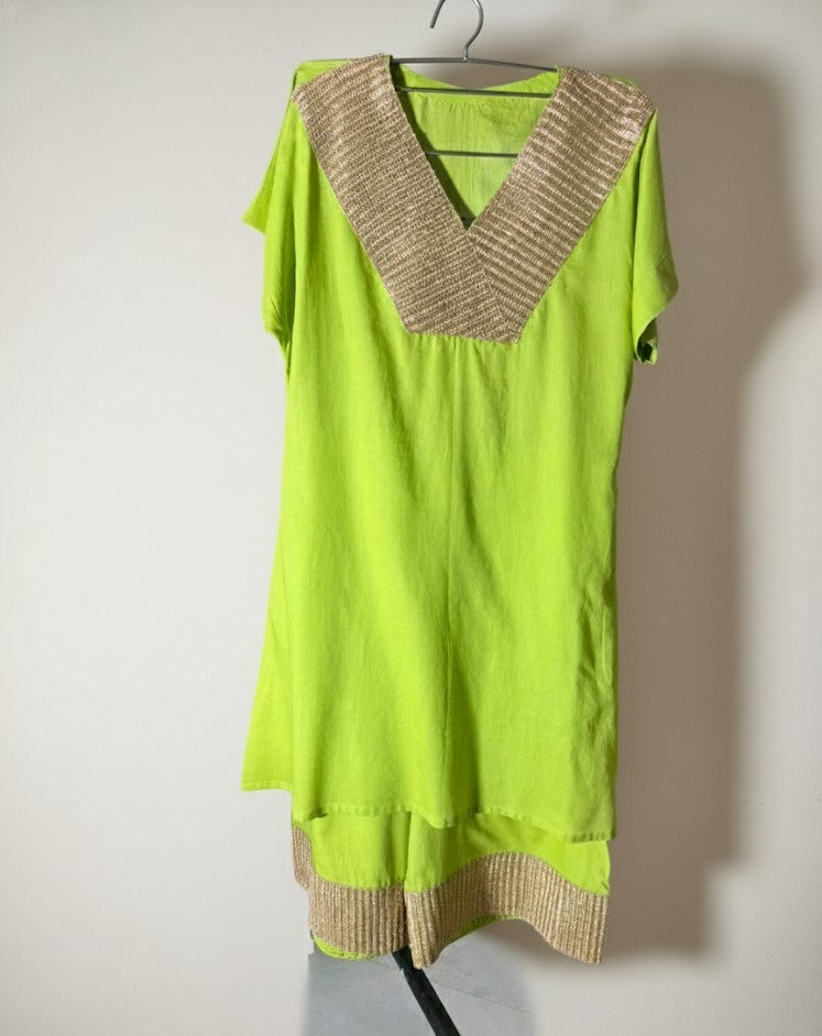 Drift into effortless style with this premium cotton set, where parrot green is beautifully elevated by the opulent zari border at the V-neck and pant hems, making luxury feel utterly comfortable.