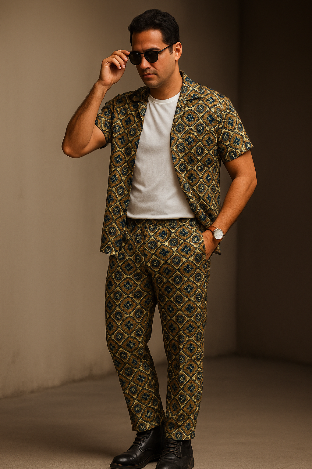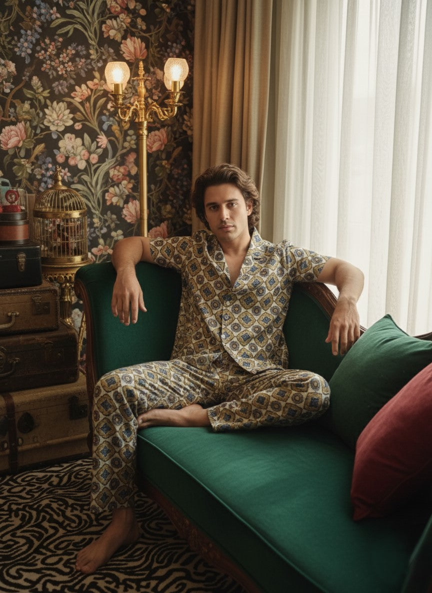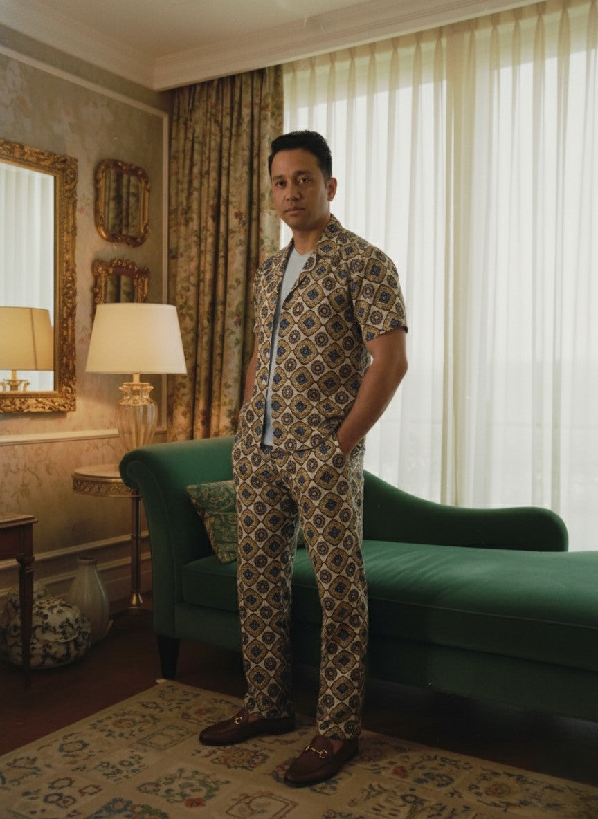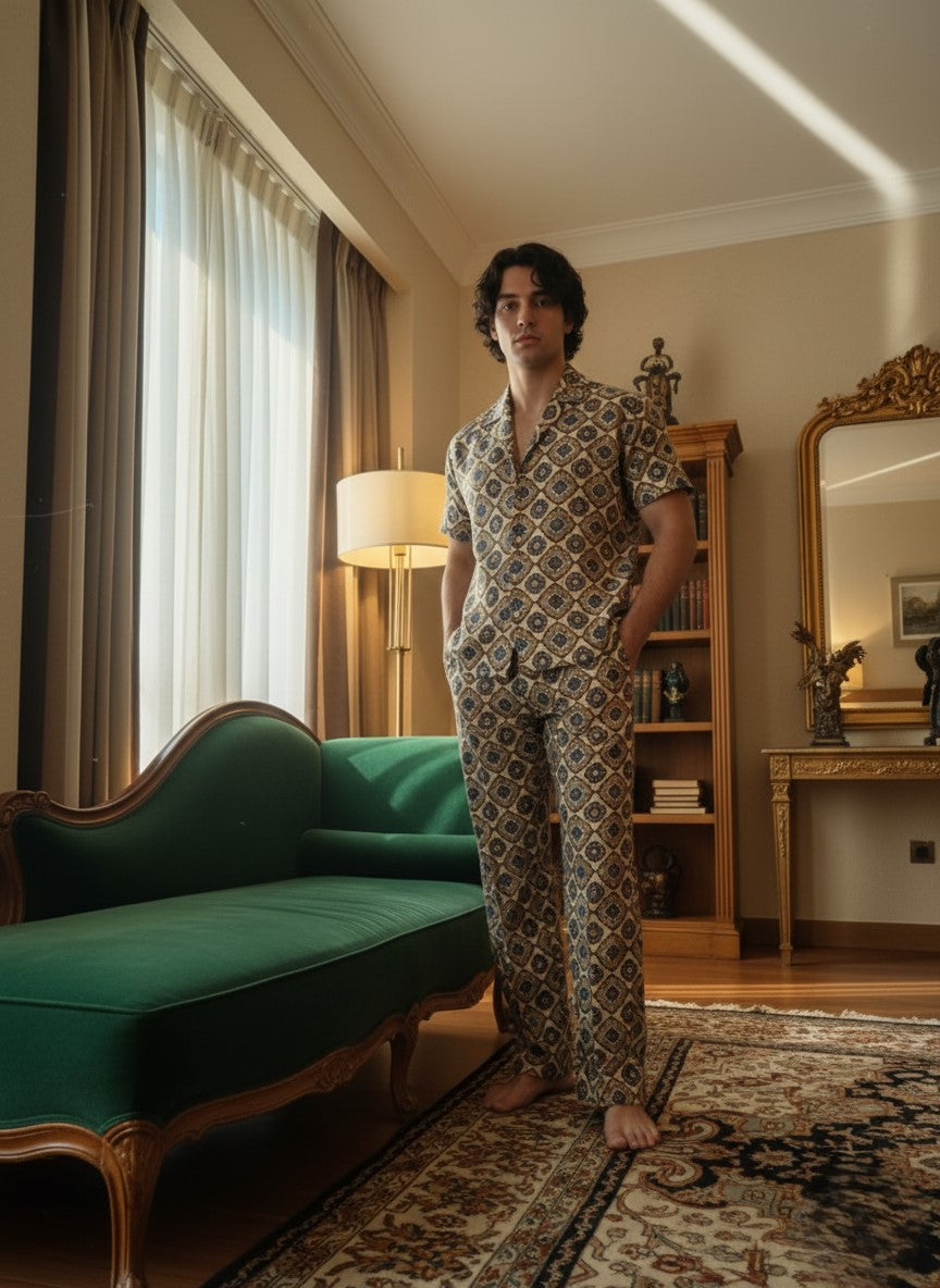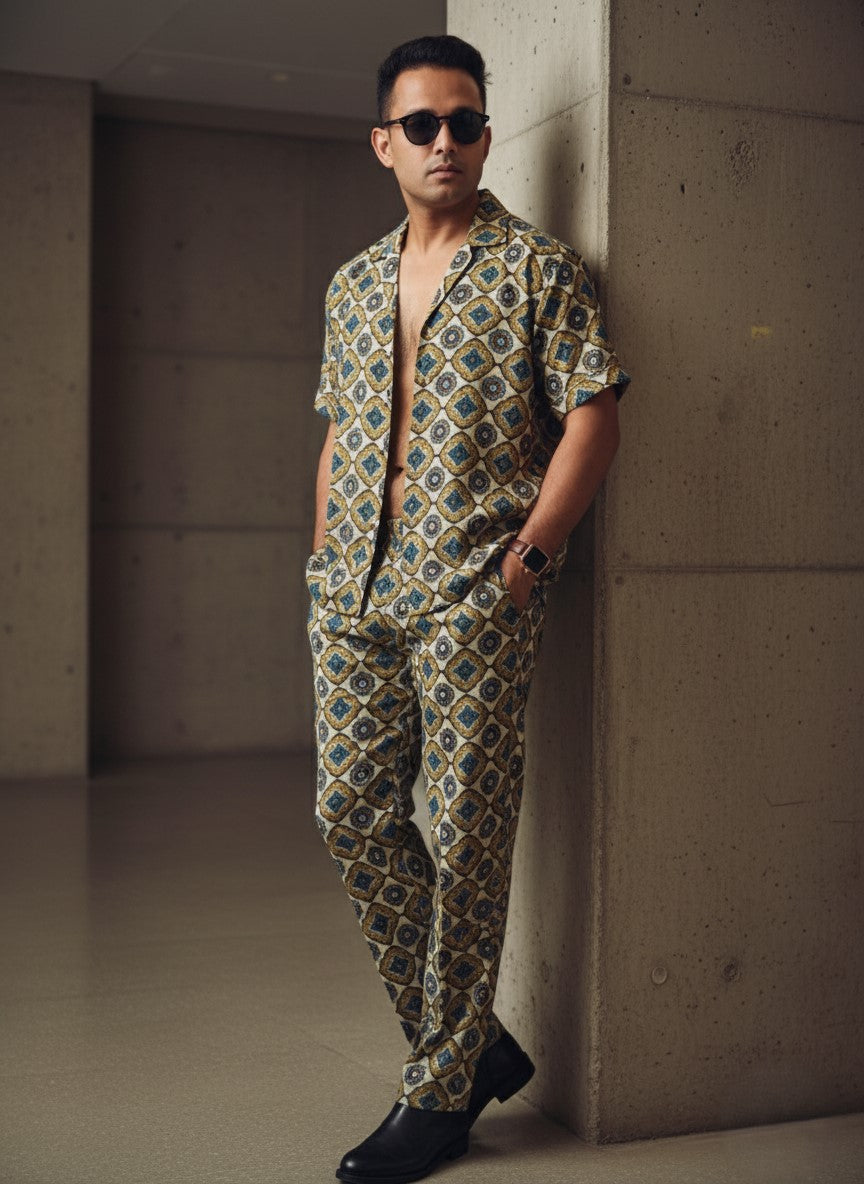 This is a stylish cotton co-ord set featuring a cuban-collar short-sleeved shirt and matching trousers, both covered in an intricate geometric, medallion-style print in shades of gold, teal, and navy on a cream or light tan background. The set offers a relaxed, yet sophisticated, look perfect for warm weather.
