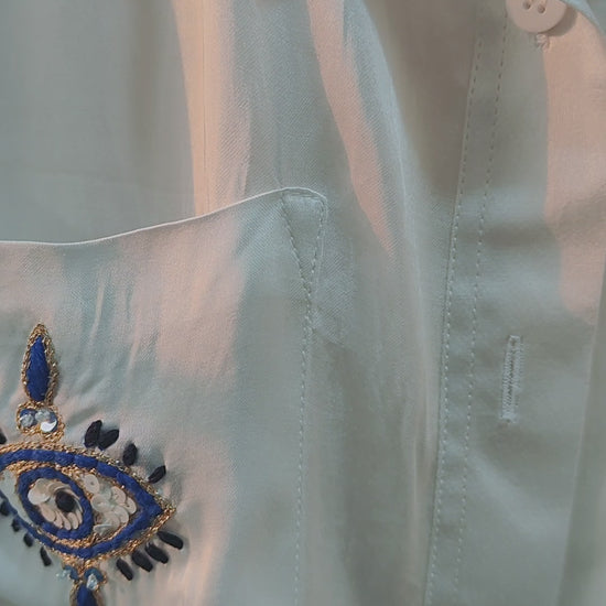 This design is centered around the Third Eye Chakra (Ajna) motif—a sacred symbol of perception, inner wisdom, and spiritual insight. Featuring deep indigo embroidery on the pockets and matching contrast detailing on the inner collar and cuffs, this shirt serves as a wearable reminder to trust your instincts and see beyond the surface.