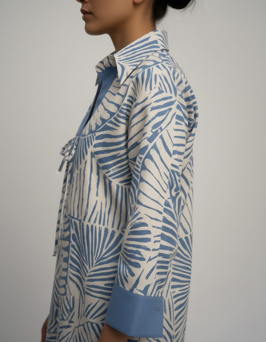 The relaxed-fit top features a striking blue and white abstract print with a distinctive open V-neck placket leading to a drawstring detail at the waist. Full sleeves with wide cuffs complete the comfortable yet confident silhouette.