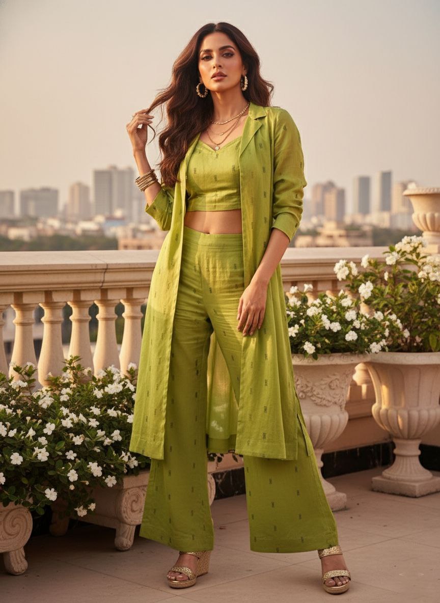 This is a vibrant three-piece co-ord set made from pure organic cotton in a lively lime green (Chartreuse) color.