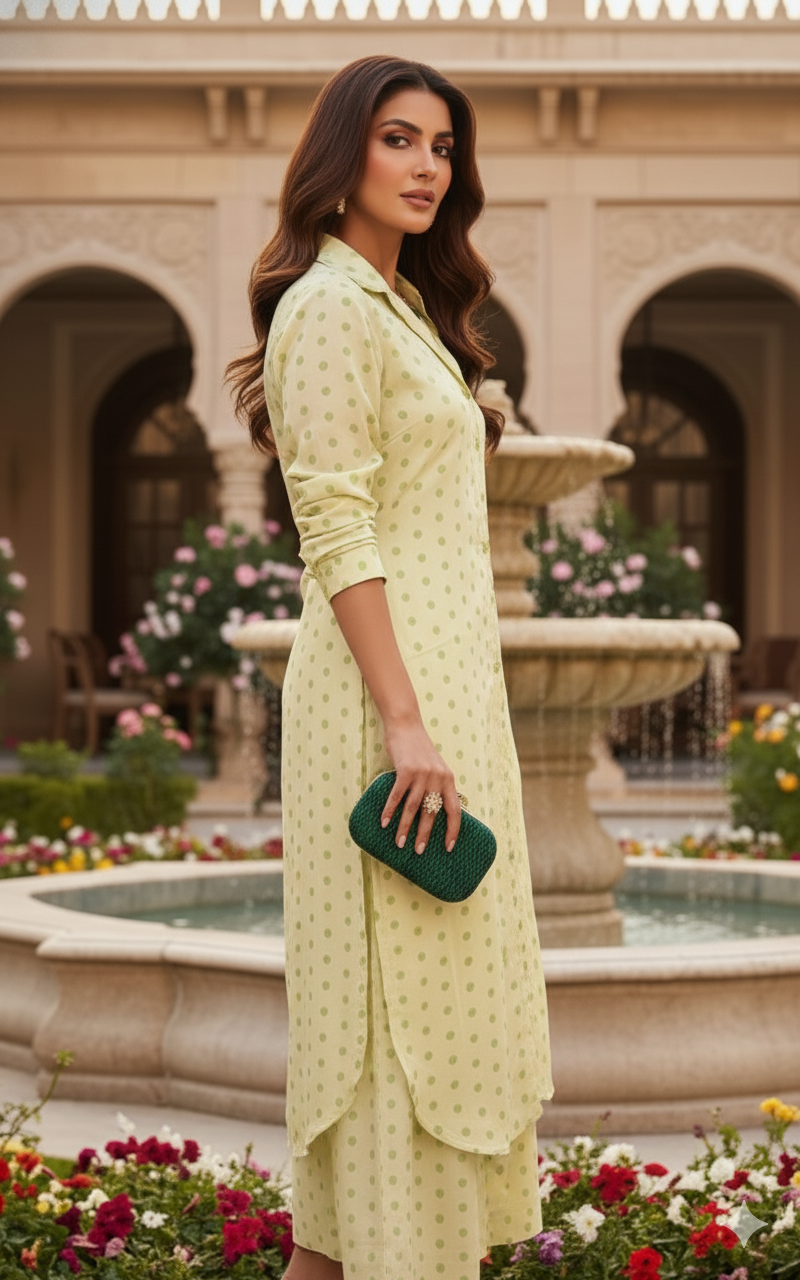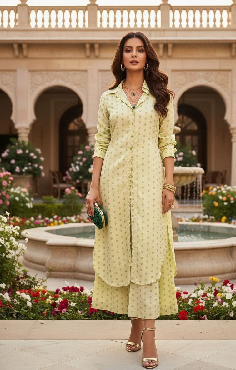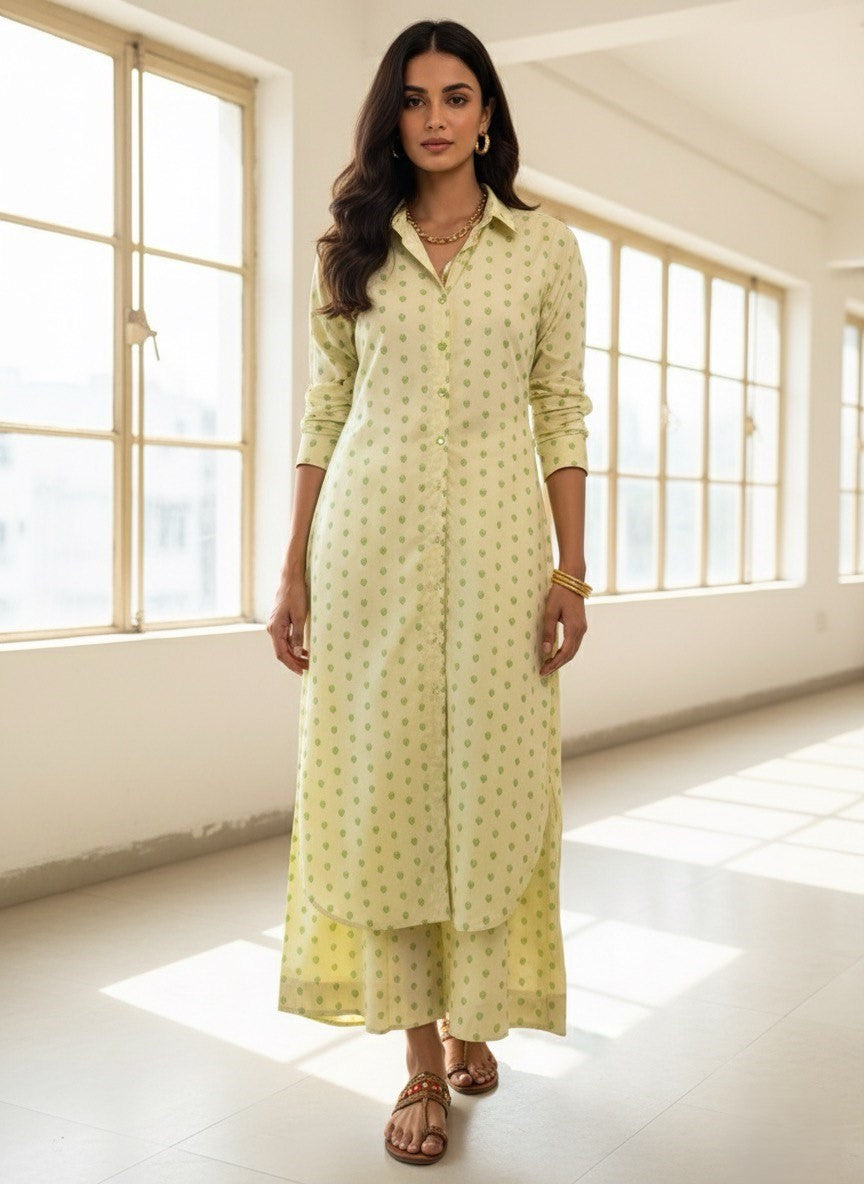 This is a stylish peridot green co-ord set consisting of a long, flowing tunic shirt with a deep collar, button-down front, and full sleeves. It is paired with matching straight-cut, slightly cropped trousers, creating an effortlessly chic and comfortable contemporary look.